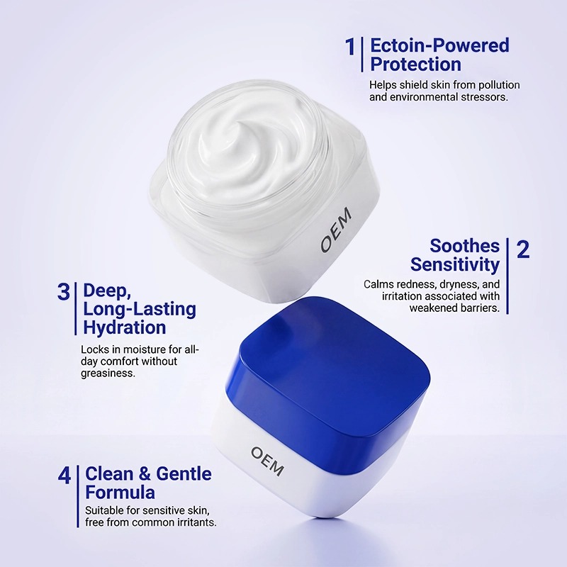 Formulada con ectoína de alta pureza, esta crema protectora ayuda a proteger la piel de los factores ambientales dañinos a la vez que proporciona una hidratación profunda y duradera. Calma la sequedad, el enrojecimiento y la tirantez, ideal para pieles sensibles y urbanas. Su textura rica pero no grasa se absorbe rápidamente. Elaborada en nuestra sala limpia GMPC, totalmente personalizable. Con la confianza de marcas internacionales.