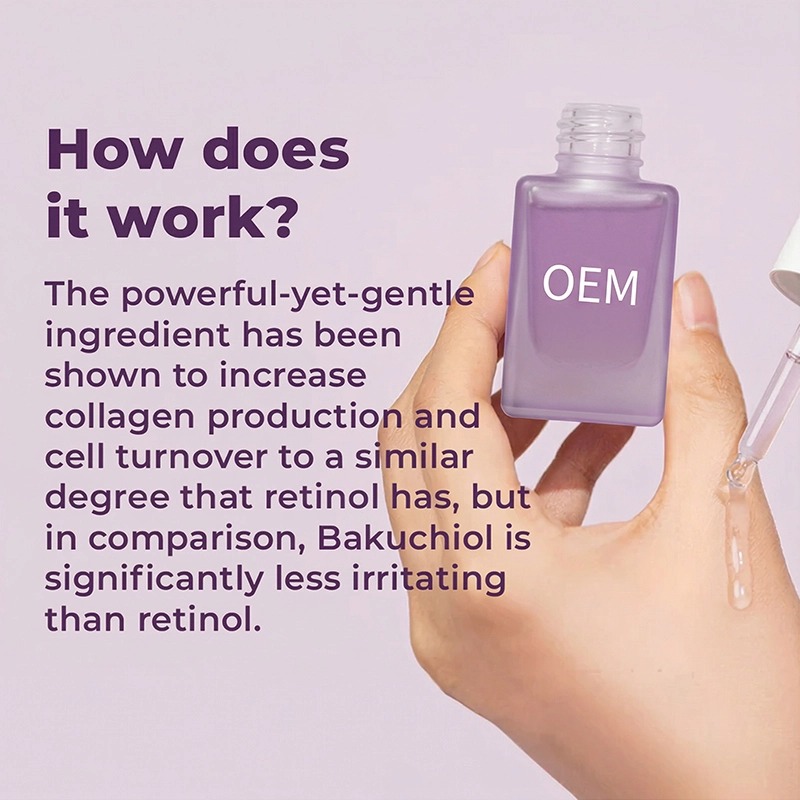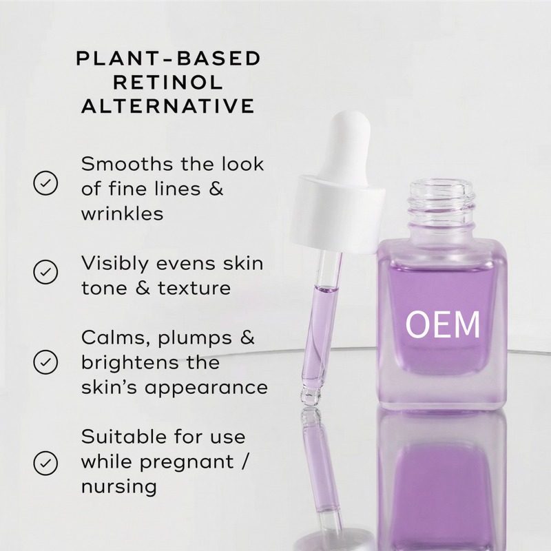 Un sérum reafirmante suave de origen vegetal que ayuda a alisar las arrugas y favorece la elasticidad, sin la irritación del retinol. El bakuchiol y los péptidos señalizadores actúan conjuntamente para mejorar la firmeza de la piel, mientras que su fórmula ligera se absorbe rápidamente. Ideal para pieles sensibles y para quienes usan retinol por primera vez. Respaldados por nuestro equipo de I+D con doctorado y sala limpia GMPC. Personalización completa: fórmula, envase, fragancia, logotipo. Cantidad mínima de pedido baja, muestreo rápido (15 días). Marcas de confianza en EE. UU., Alemania y Oriente Medio.