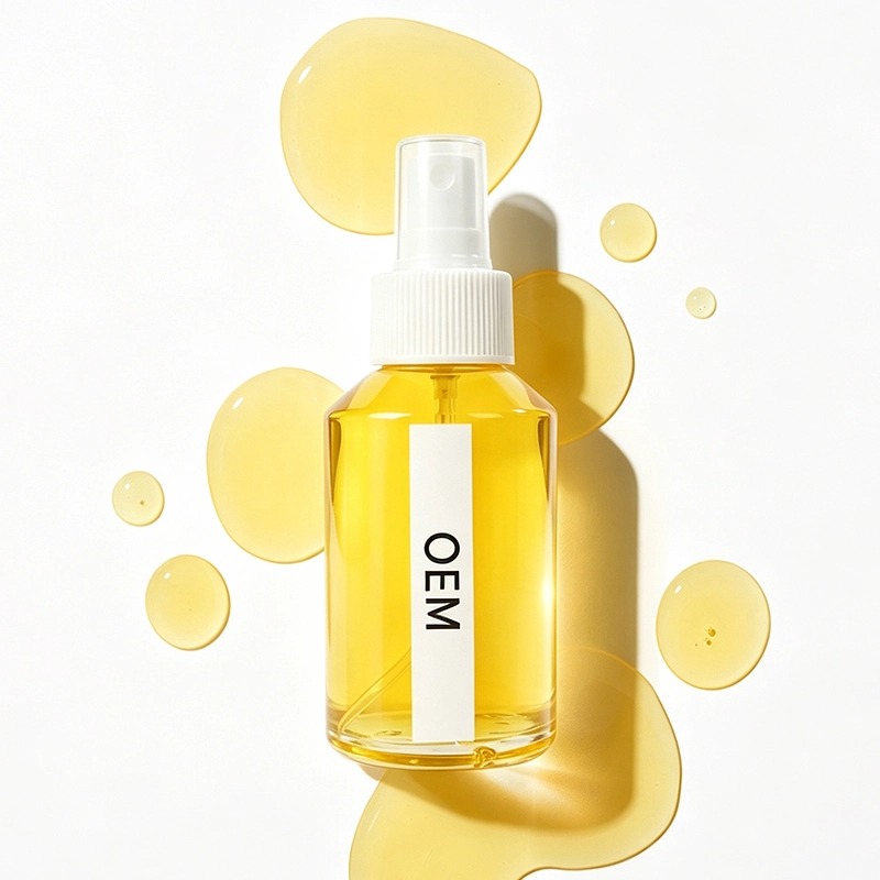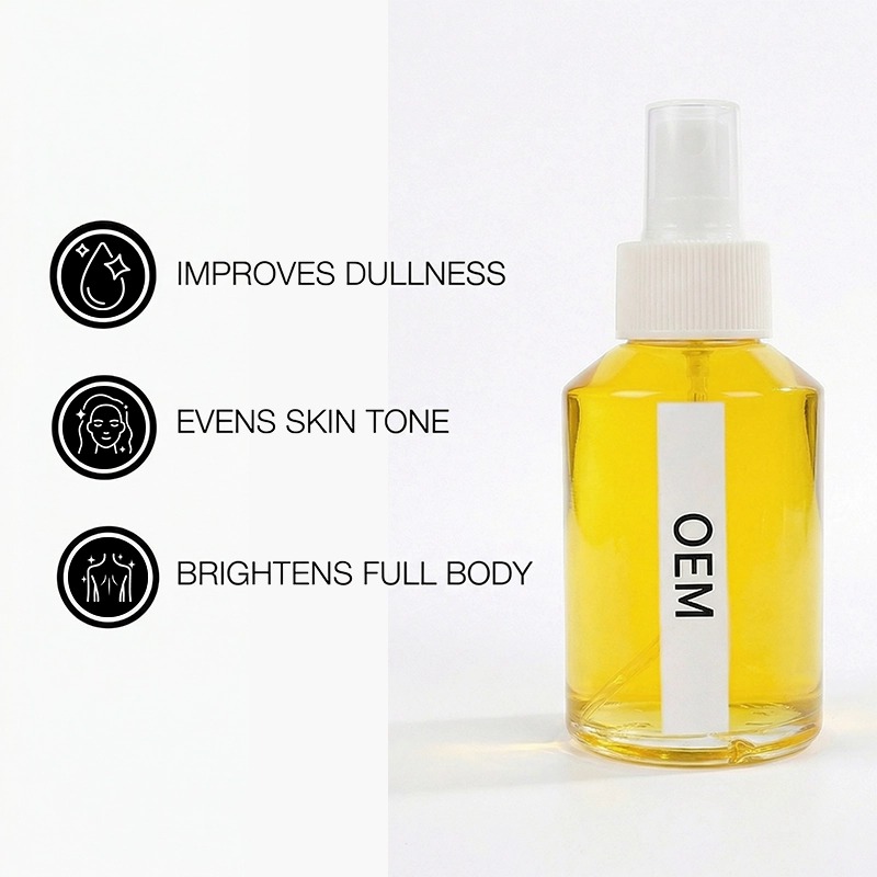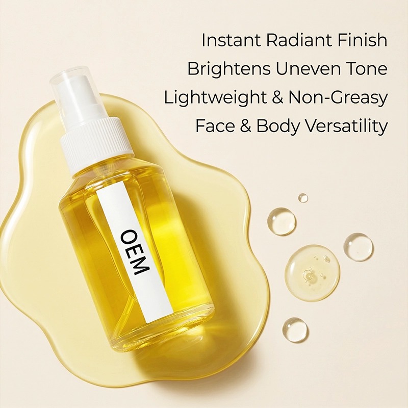 Un aceite iluminador de rápida absorción que proporciona a la piel apagada un brillo natural y mejora el tono desigual con el tiempo. Enriquecido con niacinamida y derivados de vitamina C, es ligero, no graso y apto para rostro y cuerpo. Respaldado por nuestro equipo de I+D con doctorado y nuestra sala limpia GMPC. Cantidad mínima de pedido baja, muestras rápidas. Tu fórmula, tu envase.