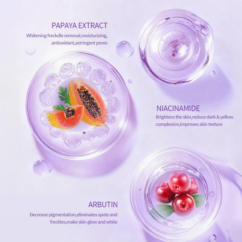 Extracto de papaya: Aclara la piel, atenúa las pecas, hidrata, proporciona protección antioxidante y cierra los poros.